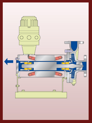 The feature of this pump is that the circulation line does not form a closed circuit. The circulation liquid passes through the front bearing housing from the impeller outlet part of the pump volute chamber into the rotor chamber, passes through the rotor chamber and after being extracted from the outlet of the rear bearing housing at the rear of the motor is returned to the vapour zone in the suction tank through the reverse circulation line.